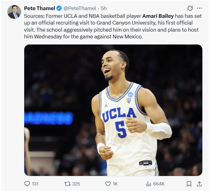 He played one year at UCLA and was drafted No. 41 overall. His visit to Grand Canyon University is tentatively set for Wednesday, Feb. 11, for the game against New Mexico.