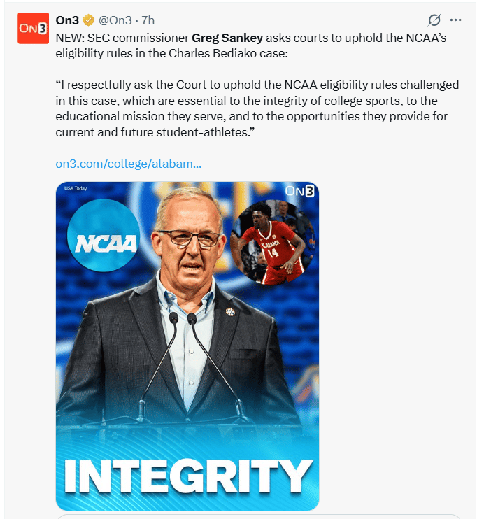 While it remains to be seen exactly what it means for Bediako’s future, Sankey officially becomes the loudest voice to speak out against his eligibility, and the harm that it could do for the entire college sports ecosystem. It’s an especially important voice given, that as commissioner of the Southeastern Conference, one of his flagship schools (Alabama) clearly benefits from Bediako playing.
