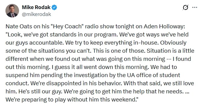 And later on his coach’s show Nate Oats admitted that Alabama is “preparing to play without” Holloway this weekend.