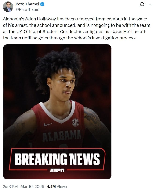 We’ll certainly let the legal process play out, but it feels fair to assume that Holloway won’t be playing for Alabama any time soon. Late Monday, ESPN’s Pete Thamel reported that Holloway has been “removed from campus.”